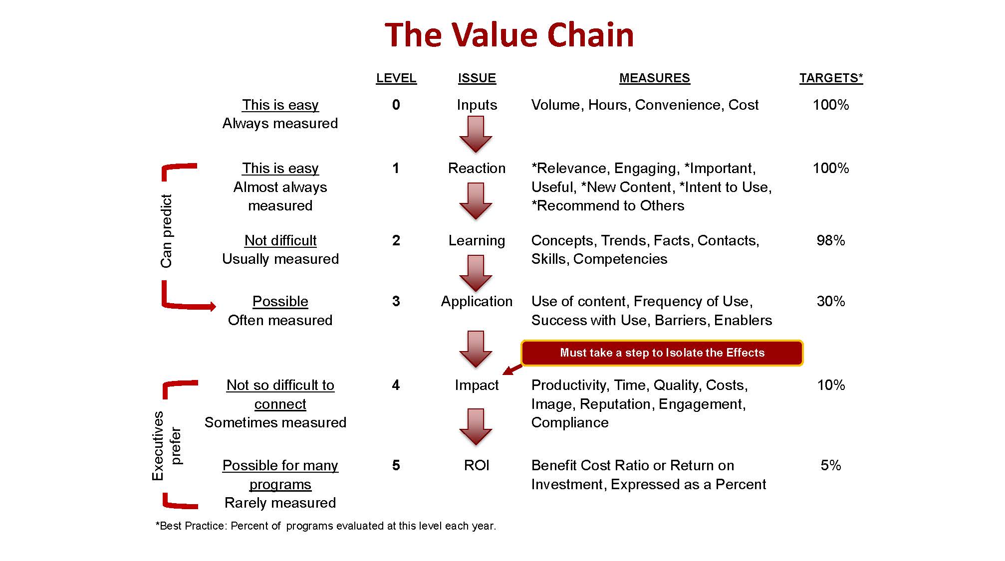 Figure 1. The Value Chain.Over the years, we’ve been moving down this value chain with evaluation, measuring reaction and learning has been accomplished for almost a century in terms of measuring the success of learning programs. Near the last half of the last century, we’ve made much progress on Level 3, Application, and beginning late last century, and now, we’ve moved into Level 4, Impact, and even Level 5, ROI. This value chain is based on a logic model that dates back to the 1800s. Raymond Katzell actually brought it to the learning and development field in the 1950s.1 Many others have adopted the concept of these levels, including the Kirkpatricks, as well as our ROI Methodology. In 1983, we wrote the first book on training evaluation, highlighting these five levels of outcomes as possibilities.2